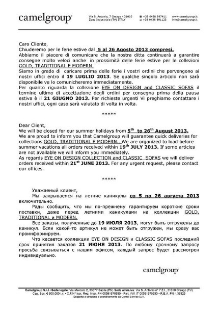 Уважаемые клиенты примите во внимание, что с 05.08 по 26.08 каждого года итальянские фабрики – производители закрываются в связи с общенациональными каникулами. Исчисление сроков выполнения заказа производится без учета данных периодов. Мы рады сообщить что по-прежнему гарантируем короткие сроки поставки даже перед летними каникулами на все коллекции фабрики Camelgroup.
